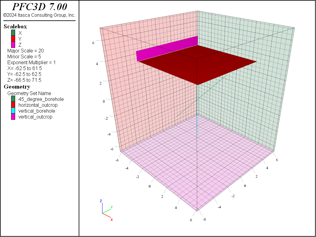For visualization and calibration purposes, several geometry objects are defined to mimic outcrops and boreholes. It is possible to compute the intersections between fractures and 1D or 2D geometries, and analyze/visualize these intersections. Two boreholes (one vertical and one dipping 45°) plus two outcrops are defined. Outcrops are composed of a single planar (2D) polygon; boreholes are defined as 1D lines. Note that it is also possible to model boreholes by cylindrical geometries: