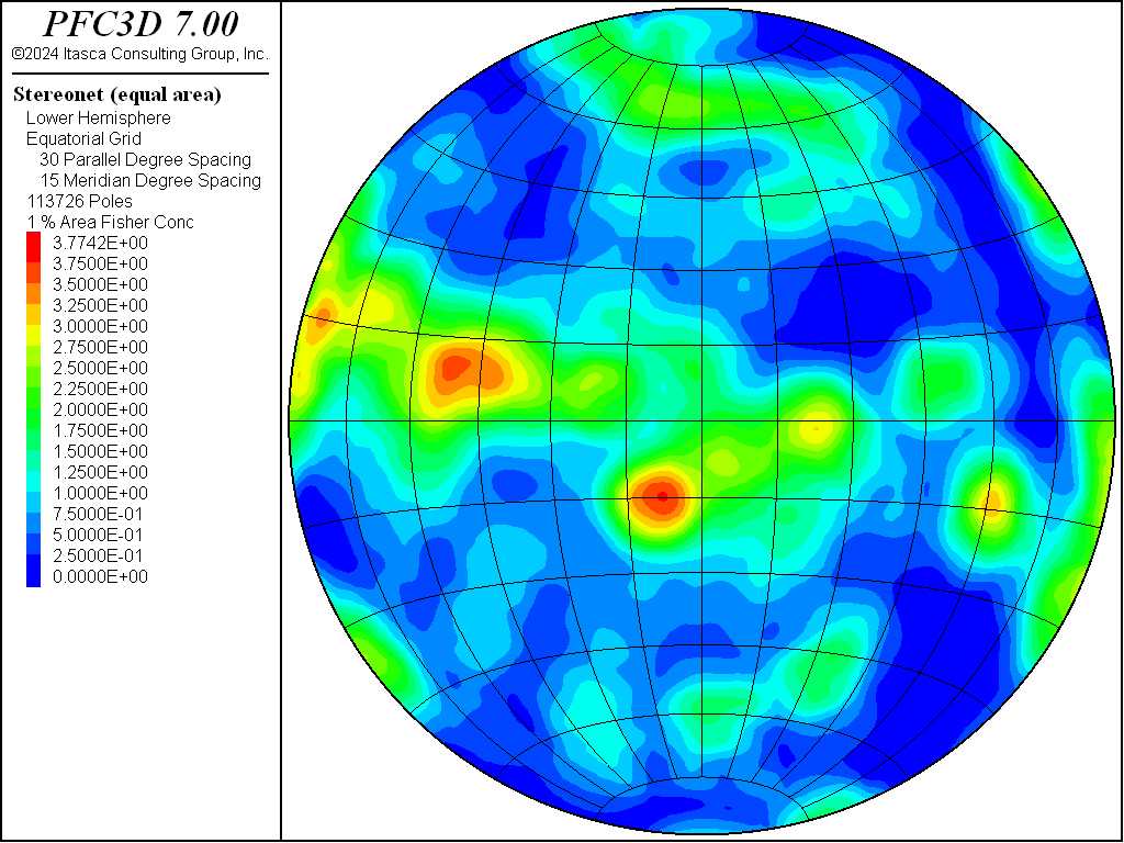 During generation, the fracture orientations are randomly selected while respecting the relative proportions of the weight column. The stereonet of the distribution used in this example is shown in Figure 1, as output by the PFC stereonet plot item.