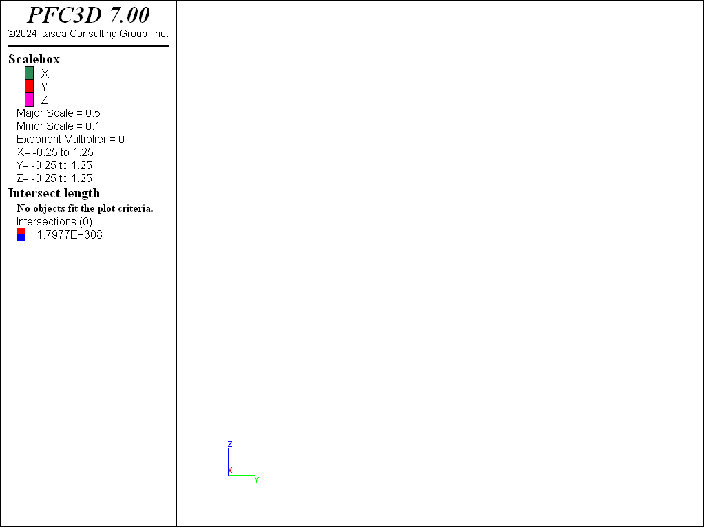 For the subhorizontal fractures, the target density is reached when the number of fractures visible on the vertical outcrop is as specified above. Since it is not a built-in option of the generation command, we use the definition of a user-defined stopping criterion. To achieve this density, we use two FISH functions: one as a modification function (the intrinsic hori_study with the modify keyword) and one as a user-defined stopping function (the hori_stop intrinsic with the fish-stop keyword) in the fracture generate command. The modification function is called as each fracture is generated and provides, as an argument, a pointer to the fracture. In this case it is used to count the number of fractures intersecting the vertical outcrop (with the FISH intrinsics fracture.gintersect). The stopping function is called after the generation of each fracture, and the generation is stopped if the function returns 1. In this case, it is used to check if the number of fractures intersecting the vertical outcrop is the target number: